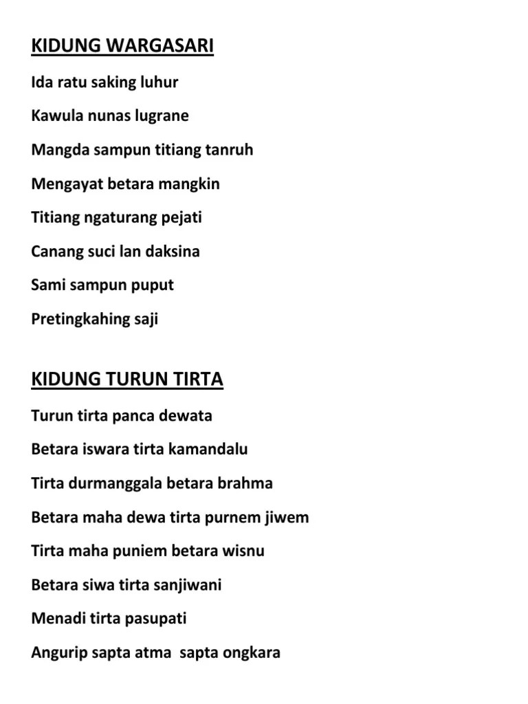 Ancangan sadulur, ngangge sekar jepun,. Ida ratu saking luhur, kawula nunas lugrane, 3. Sekar alit sering disebut juga geguritan, pupuh atau tembang. Warna pakaian termasuk destar di dalam upacara persembahyangan tidak terikat. Pupuh wargasari ida ratu saking luhur (karya nn ) ida ratu sakeng luhur kahula nunas lugrane mangda sampun titiang tandruh mengayat bhatara mangkin titiang .